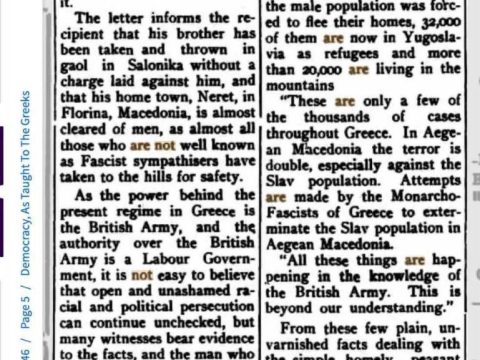 Бегалците од Егејска Македонија ни раскажуваат… По свршувањето на тешката и крвава војна, кога сите слободољубиви народи — кои што се храбро бореа против германскиот окупатор — тргнаа по слободниот пат на обновата и изградувањето на своите земји, по патот кон побогата и посреќна иднина на најјужниот дел на Балканскиот полуостров во Грција — започна невидениот терор на монархофашистичкиот режим,…