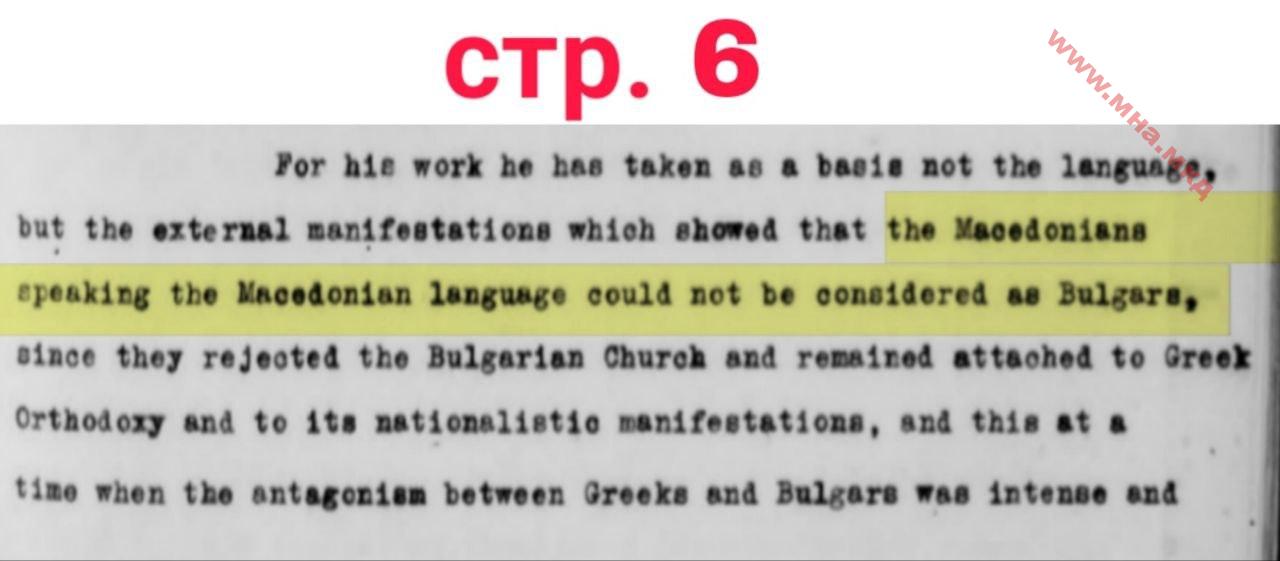 „… Македонците што зборувале македонски јазик не можат да се сметаат за Бугари, бидејќи ја одбивале бугарската црква и останувале верни на грчкото православие и неговите национални манифестации – и тоа во време кога антагонизмот меѓу Грците и Бугарите бил остар, а одбивањето на бугарштината значело опасност по животот и истребување. …”