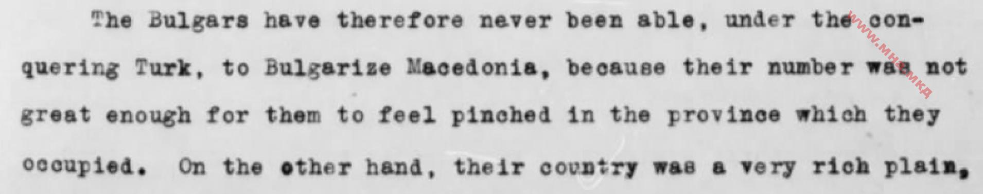 „… Бугарите, следствено, никогаш не можеа, под освојувачкиот Турчин, да ја бугаризираат Македонија, бидејќи нивниот број не беше доволно голем за да се чувствуваат стеснети во покраината која ја окупираа. Од друга страна, нивната земја беше многу богата рамнина, и тие, следствено, немаа засегнатост да ја напуштат богатата земја за да се населат во друга која беше прилично планинска и следствено помалку плодна. …“