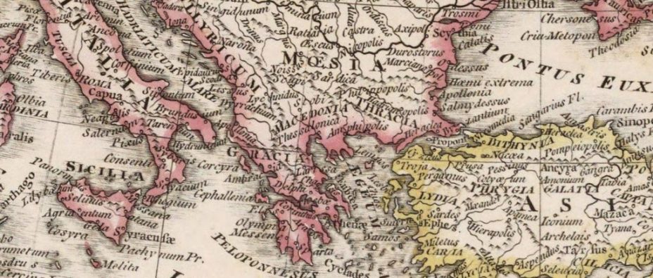 Англиска земјописна карта за древноста. Macedonia на средина меѓу – Moesia на север, Thracia на запад, Gracia на југ, Hadriaticum Mare на запад и Illyricum на северозапад.