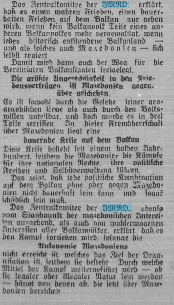 „… Централниот комитет на ВМРО изјавува дека вистински и траен мир на Балканот ќе има само кога ниедна балканска нација нема да наруши делови од друга балканска нација, кога секоја историски воспоставена балканска земја – а со тоа и Македонија ќе се управува сама со себе. Најголемата неправда во мировните договори е извршена против Македонија. Таа е неделива и според законите на нејзината географска локација и според волјата на народот, а сепак е растргната на три дела. Ова туѓо владеење над Македонија претставува трајна криза на Балканот. Оваа криза постои половина век, уште откако Македонците почнаа да се борат за своите национални права, својата политичка слобода и својата самоуправа. ВМРО изјавува дека ќе продолжи со својата борба сè додека не се постигне автономија на Македонија. …“