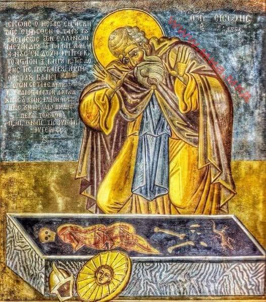 Ова е фреска од Сливничкиот манастир, изграден и живописан во 1607 година, во периодот на јеромонахот Никанур. На фреската е прикажан Св. Сисој Велики како го оплакува гробот на Александар Македонски.