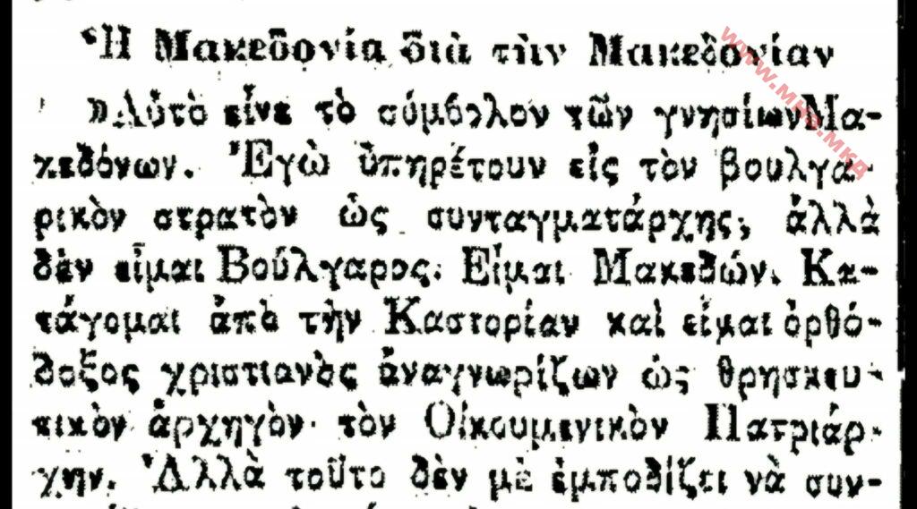– Αυτό είναι το σύμβολο των αληθινών Μακεδόνων. Υπηρέτησα στον βουλγαρικό στρατό ως συνταγματάρχης, αλλά δεν είμαι Βούλγαρος. Είμαι Μακεδόνας. Κατάγομαι από το Κόστουρ και είμαι Ορθόδοξος Χριστιανός που αναγνωρίζει τον Οικουμενικό Πατριάρχη ως θρησκευτικό του ηγέτη. Αλλά αυτό δεν με εμποδίζει να συνεργαστώ με όποιον εργάζεται για την απελευθέρωση της πατρίδας μου από τον τουρκικό ζυγό. Θέλουμε μια αυτονομία, όπως αυτή της Κρήτης, υπό έναν Χριστιανό ηγεμόνα, που θα παρέχει κάποια ασφάλεια, τιμή, ζωή και περιουσία σε αυτό το άτυχο μέρος. Αγωνιζόμαστε ενάντια στην ιδέα της διαίρεσης της Μακεδονίας μεταξύ των διαφόρων γειτονικών κρατών.