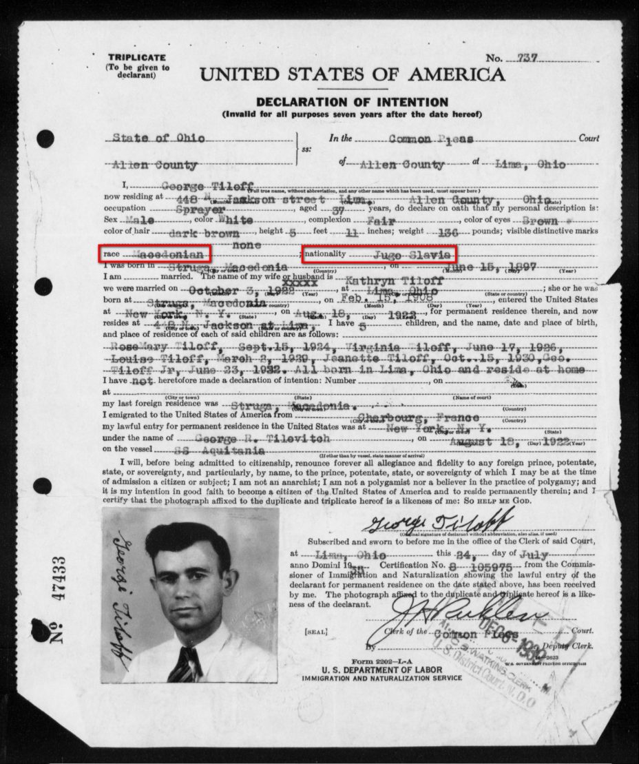 Уште еден американски документ за добивање на американски граѓанство од страна на стружанецот Ѓорѓија Тилов, каде иако запишал дека произлегол од [кралство] Југославија, по народна самоопределба, себе си се изјаснил како Македонец.