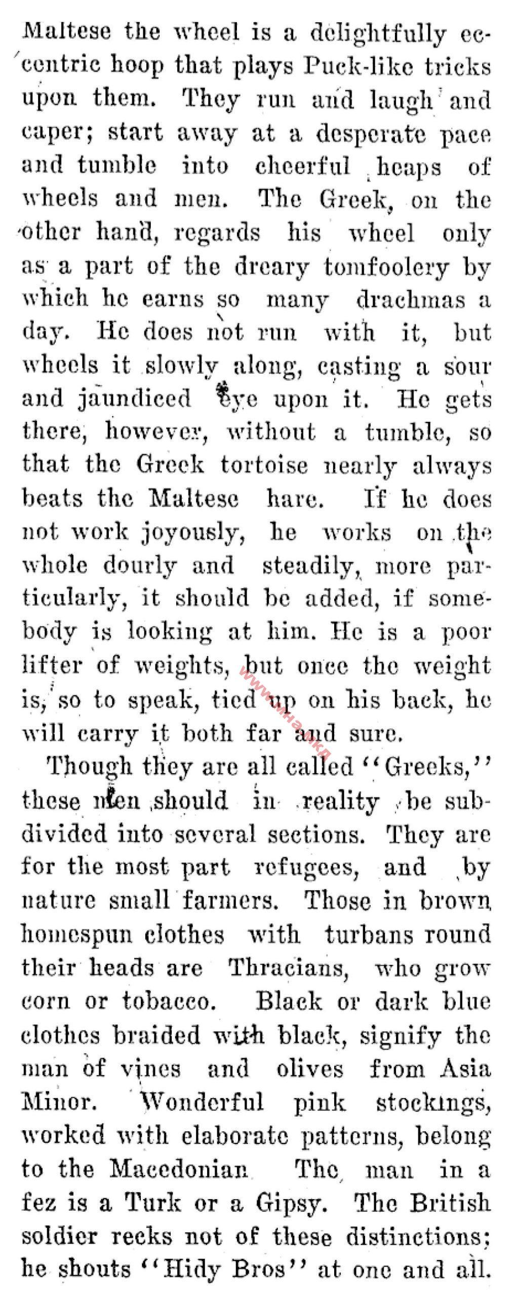 The Greek, on the other hand, regards his wheel only as a part of the dreary tomfoolery by which he earns so many drachmas a day. He does not run with it, but wheels it slowly along, casting a sour and jaundiced eye upon it. He gets there, however, without a tumble, so that the Greek tortoise nearly always beats the Maltese hare. If he does not work joyously, he works on the whole dourly and steadily, more particularly, it should be added, if somebody is looking at him. He is a poor lifter of weights, but once the weight is, so to speak, tied up on his back, he will carry it both far and sure.