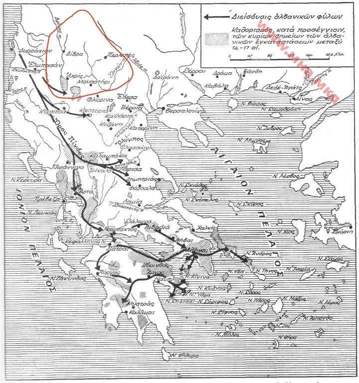 Google превод: „Пенетрација на албанските племиња Кадорисрос, приближно, на главните точки на албанските населби помеѓу 14-17 век. “