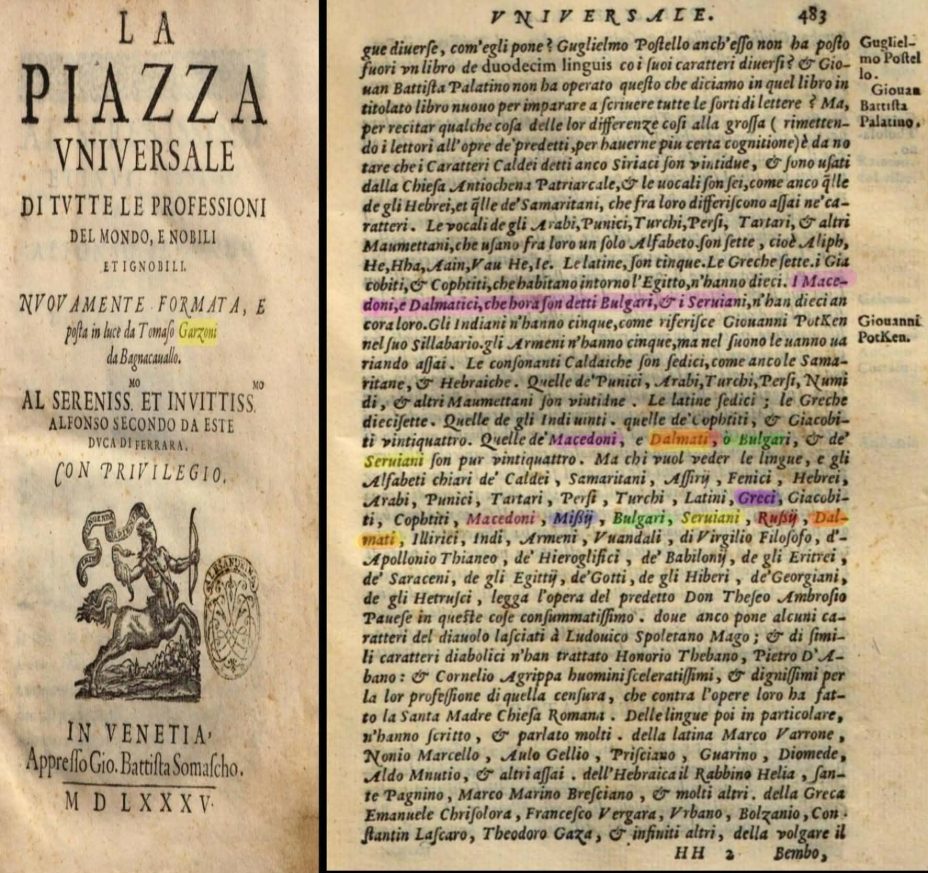 „La Piazza Universale“ е општознателно (енциклопедиско) дело од доцната ренесанса во 1585 година во која писателот Томазо Гарзони прави опис на различните народи, според тоа какви азбуки и писма користат. Во таа смисла творецот на делото ги набројува Македонците како посебен народ, со посебен јазик, одделно од Бугарите, Србите, Мизијците, Далматинците, Русите, Грците и другите народи. Ова јасно покажува дека во неговата класификација Македонците се сметани како самостојна посебна народна и јазична група.