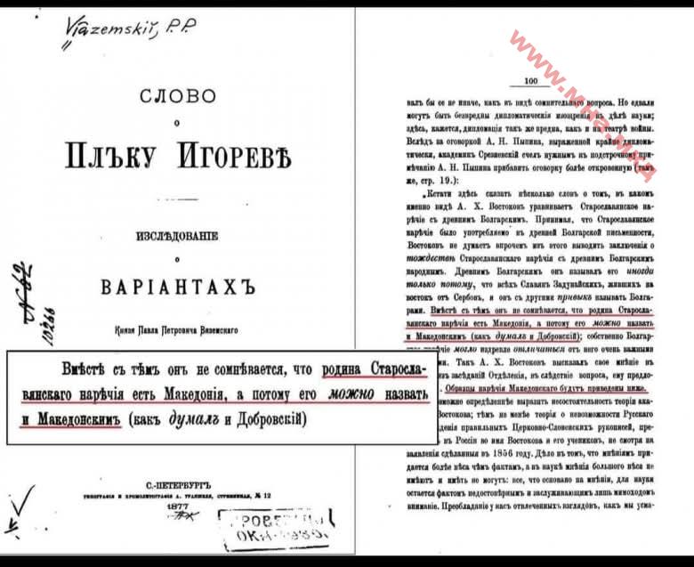Posted in А10.1 Слика и посока 1877_Павел Петрович Вяземский – ‘Слово о Плъку Игоревѣ’ „… Татковина на Старословенското наречје е Македонија, поради тоа истото можеме да го наречеме Македонско …“ Слична содржина1920.02.10_The Guradian - The Thracian question, p5Powered by Inline Related Posts