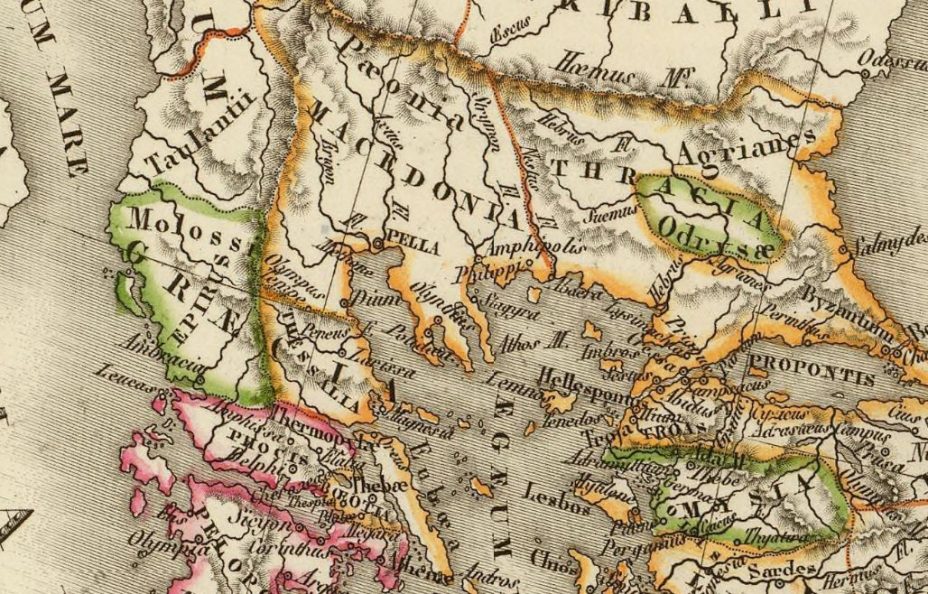 Македонија за време на Александровото Царство како посебна земја. Илирик на запад, Трибалите на север, Тракија на исток и Грција на југ. Жолтата граница на Македонија опфаќа делови од Тракија и Грција затоа што тогаш ги владеела.