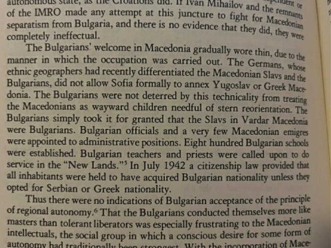 „… Тоа не беше нужно показател дека Македонците од Вардарска сакаа да бидат во секој поглед претворени во Бугари. … Германците, чии народносни земјописци правеа разлика меѓу македонските Словени и Бугарите, не ѝ дозволија на Софија формално да ја припои југословенска или грчка Македонија. …“ „… Топлиот македонски дочек на бугарските сили (и нивните организатори од прифатните комитети) може да…
