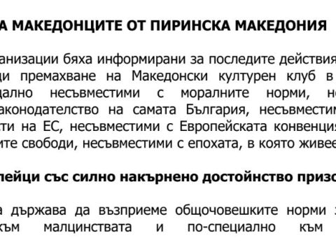 Повик од повеќе здруженија на Македонците во пиринска Македонија, бугарската држава да им ги оствари нивните национални права. * Здружението за заштита на основните човекови права, * ОМО „Илинден“, * Македонско меѓународно движење за човекови права, * Здружението на репресирани Македонци во Бугарија, * Антички Македонци, * Граѓанската иницијатива за признавање на македонското национално малцинство во Бугарија, * Комитет за…