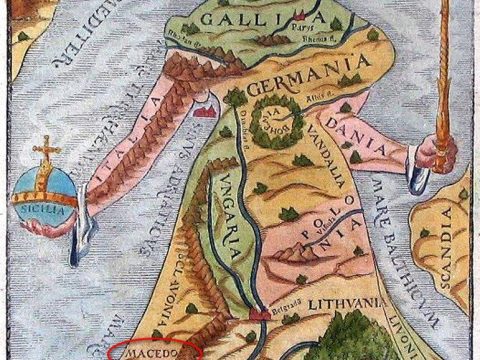 Првата земјописна карта каде што Европа е претставена како девојка. Македонија е исцртана како посебна земја одвоена од Грција, Бугарија, Склавинија и други земји. Посочил: Vintage Maps
