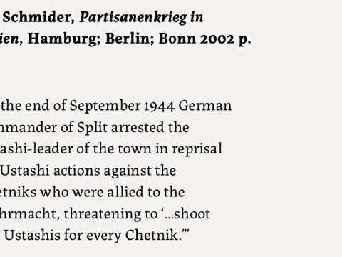 „… На крајот од гроздобер 1944, германскиот командант на Сплит го уапсил усташкиот водач на градот како присила за усташките дејства против четниците, кои беа сојузници на Вермахтот, заканувајќи се за ‘стрелање на пет усташи за секој четник’. …“